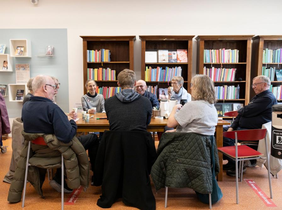 Her mødtes otte engagerede borgere og tre byrådskandidater fra hhv. Socialdemokratiet, Danmarksdemokraterne og Det Konservative Folkeparti til en samtale om emner, de valgte i fællesskab. En biblioteksmedarbejder hjalp med at facilitere samtalen, som forløb i en god og rolig stemning – også selv om der var stærke holdninger i rummet.